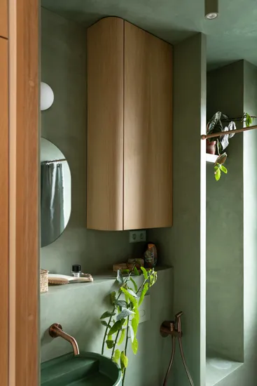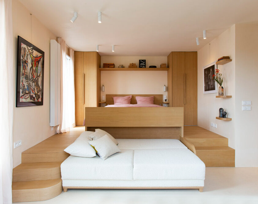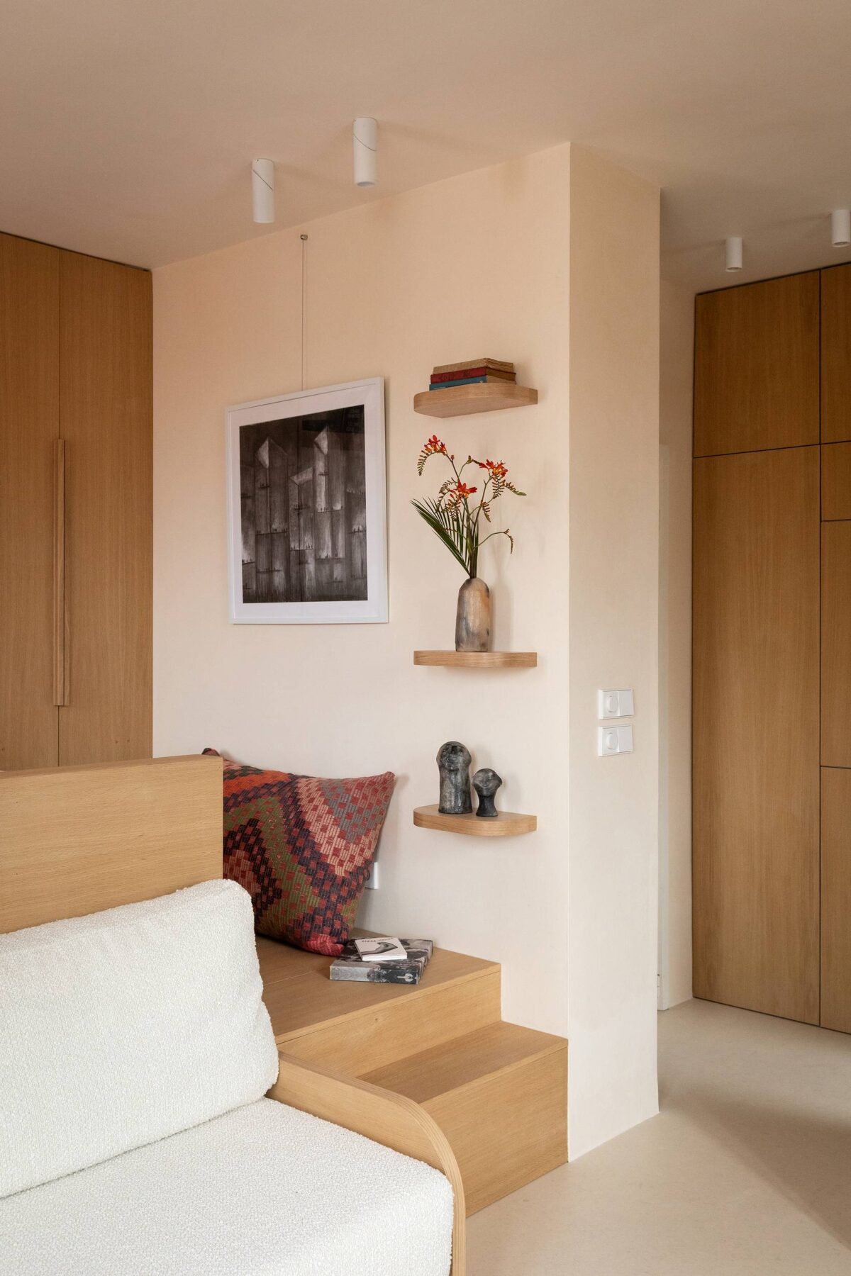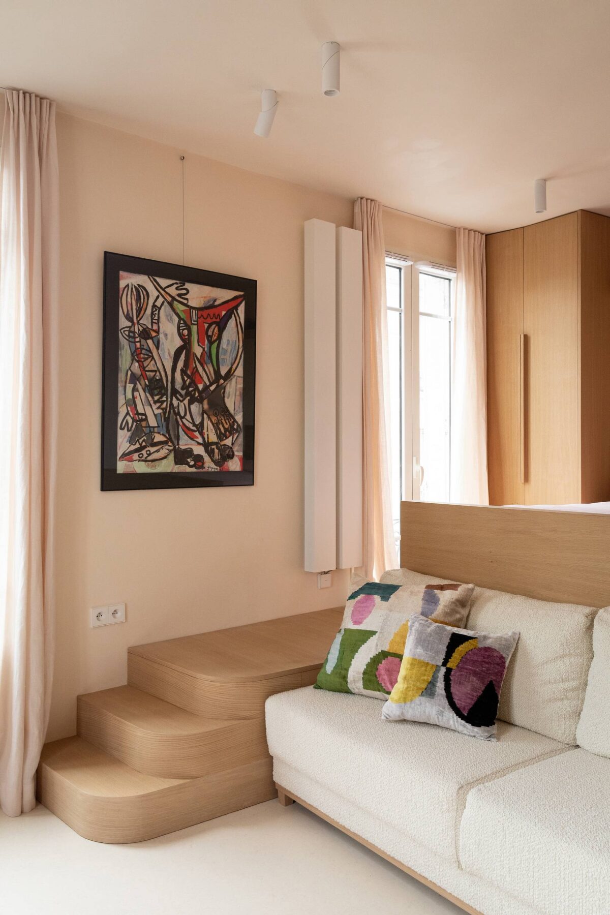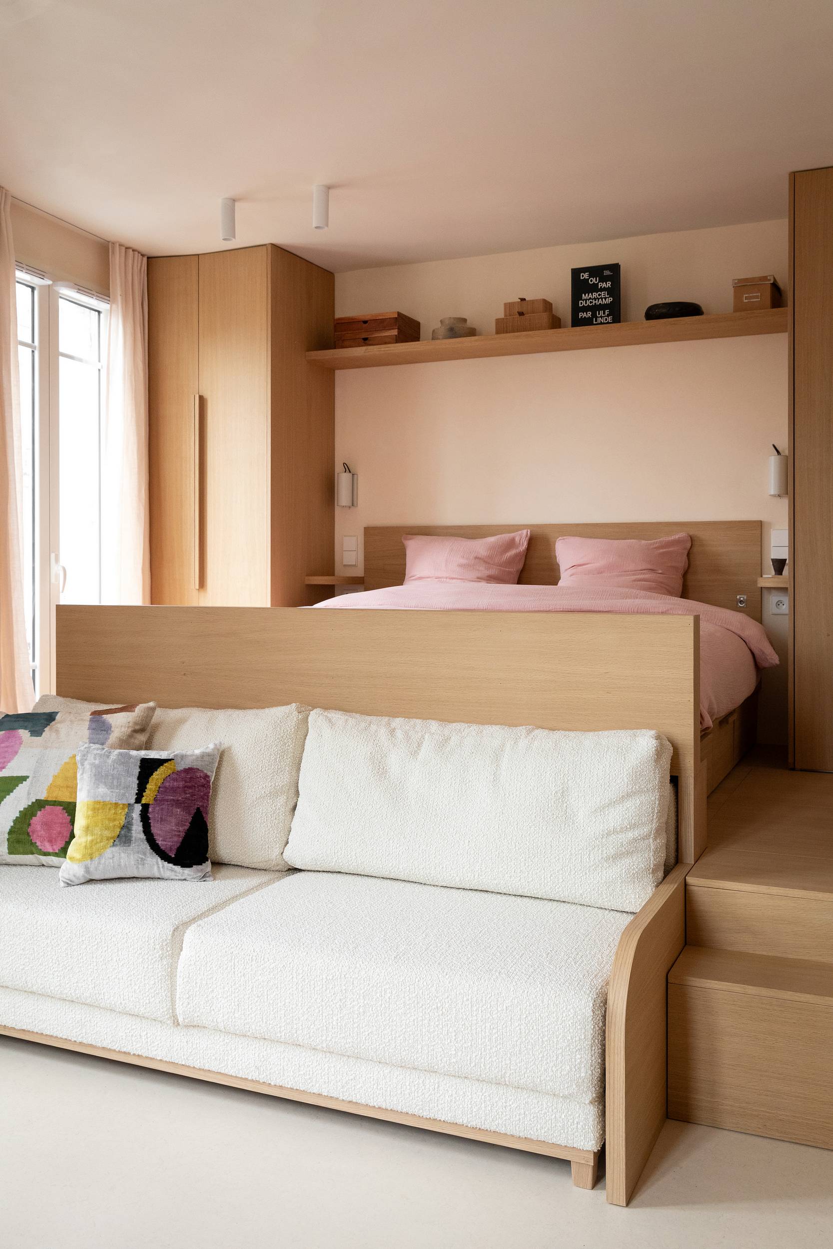 In Montorgueil, één van de meest levendige wijken van Parijs, toverde de Belgische architect Joshua Florquin een verouderd tweekamerappartement van 27 m2 om tot een lichte, mediterrane mini-suite. Het project van de architect, met studio’s in Parijs én Gent, werd ontworpen voor een koppel uit het Midden-Oosten met een kind, dat hier een pied-à-terre wilde creëren. Hun wens: een compacte plek die de sfeer van een luxueuze hotelsuite ademt, met het bed als stralend middelpunt. Florquin beantwoordde die vraag door het bed letterlijk op een podium te plaatsen. Het verhoogde platform geeft de nachtzone een gevoel van afzondering, terwijl de treden niet alleen de toegang vormen, maar ook extra zit- en bergruimte verbergen.