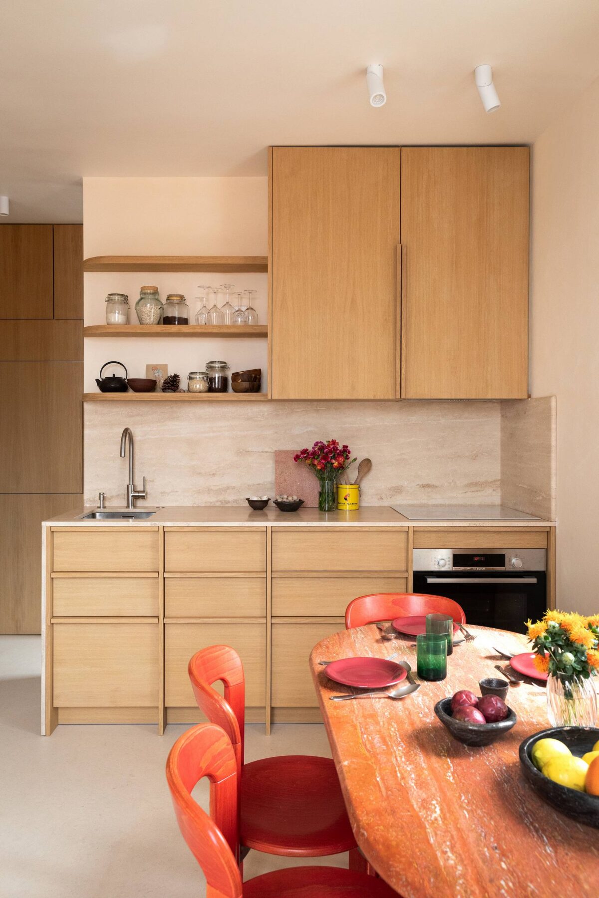 De leefruimte werd zorgvuldig gecomponeerd: een op maat ontworpen sofa die kan uitklappen tot bed voor twee gasten, een tafel in rood travertijn met iconische stoelen van Bruno Rey en lichte kalkmuren die de ruimte baden in mediterrane zachtheid. Door de zuidoostelijke ligging valt het daglicht gul binnen via drie ramen in de leefruimte en een vierde in de badkamer. Alles werd op maat ontworpen door Florquins atelier, van de keuken en sofa tot trap en tafel. Het resultaat is een interieur dat compact en efficiënt is, maar tegelijk royaal aanvoelt. Een mini-suite die Parijse elegantie en mediterrane warmte combineert, en die meteen toont hoe Belgische architectuur zich verankert in de internationale wooncultuur.