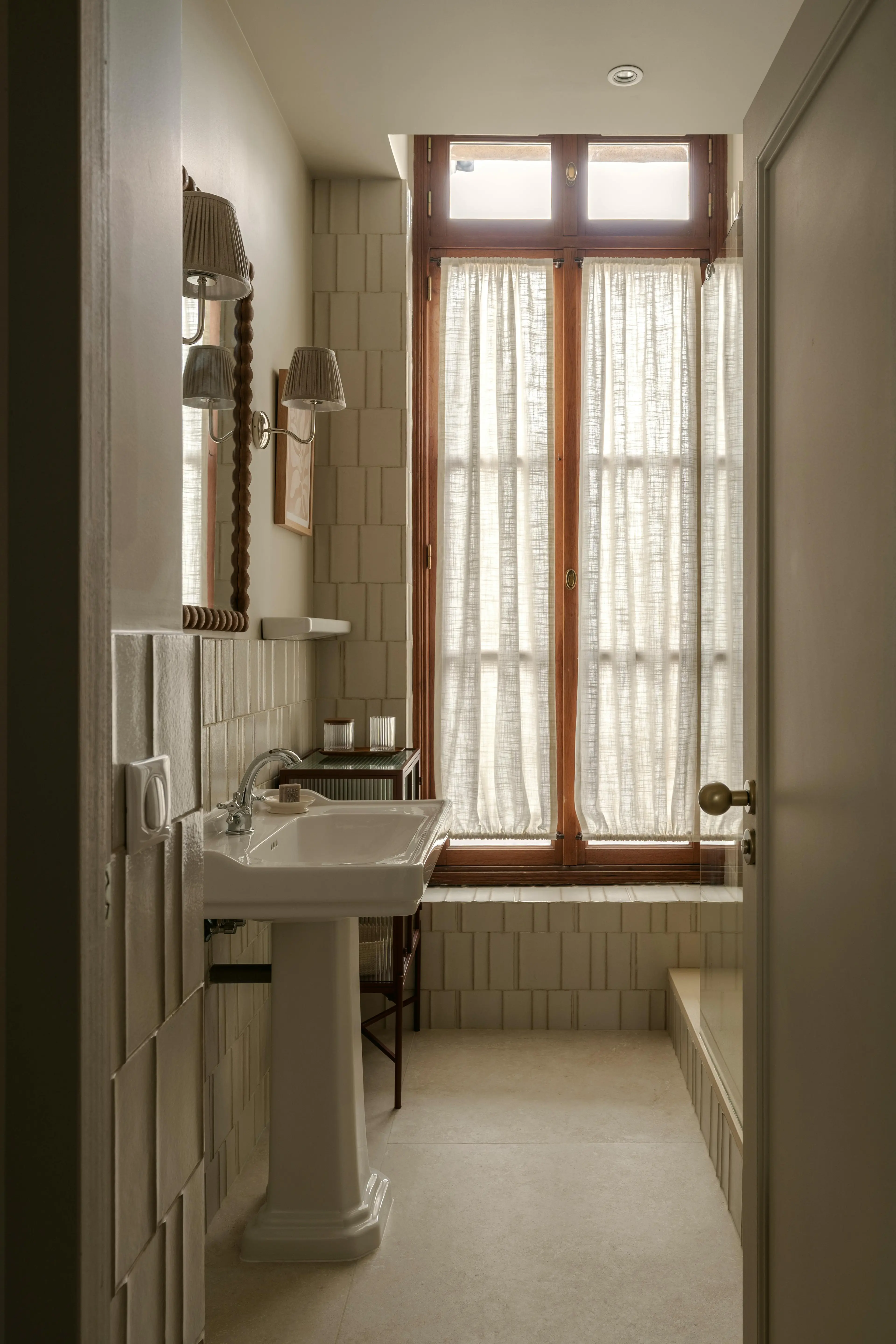 Hoe charmant ook, het appartement van 84 m2 had te weinig lichtinval en er waren slechts één slaapkamer, een badkamer en een aparte keuken. Te klein voor vier personen, tenzij de ruimte volledig opnieuw werd ontworpen. “We verplaatsten de keuken naar de ruime woonkamer, zodat er bij de ingang plek vrij kwam voor een gezinsbadkamer met wasruimte. De oorspronkelijke slaapkamer is opgesplitst in twee knusse, compactere kamers, terwijl de hoofdslaapkamer nu aansluit op de voormalige badkamer. De leefruimte is ontworpen met flexibiliteit in het achterhoofd, met een comfortabele zithoek als centraal punt. August koosvoor materialen die een eigentijdse interpretatie van de Parijse mythe uitstralen.