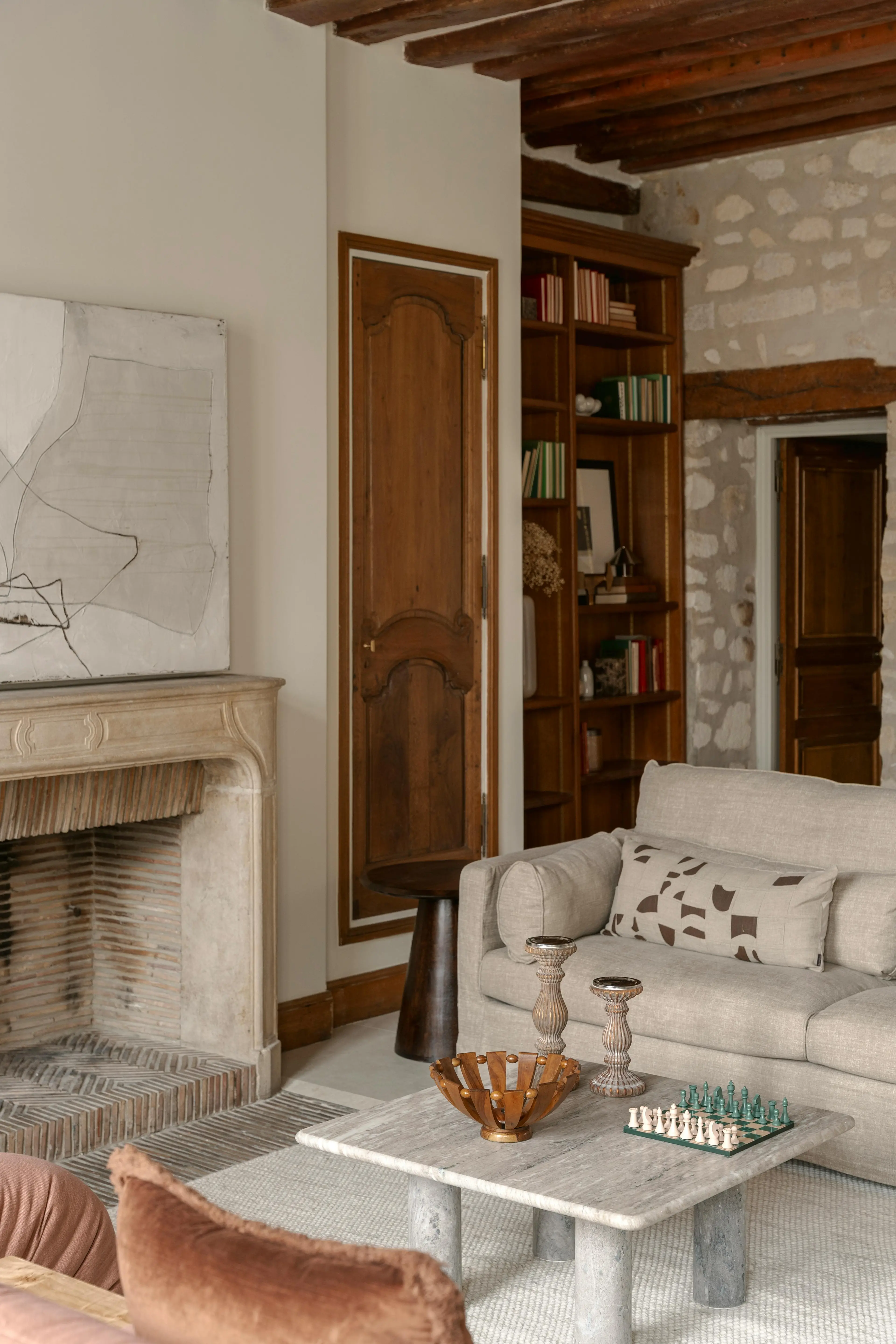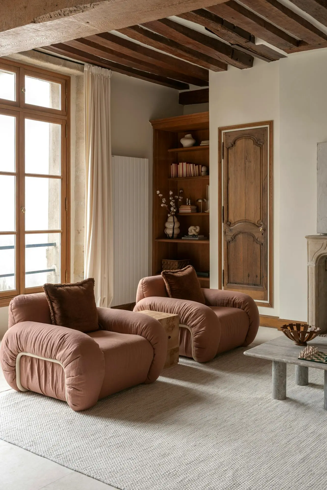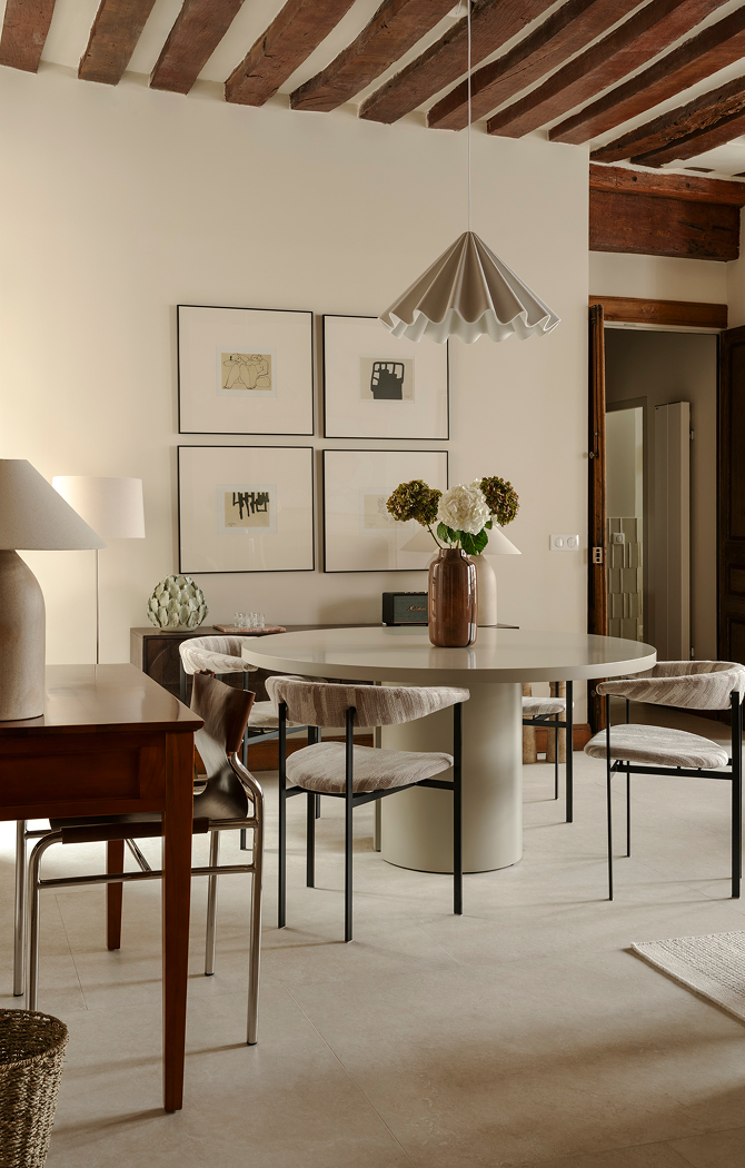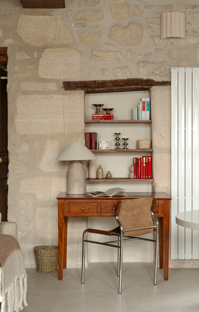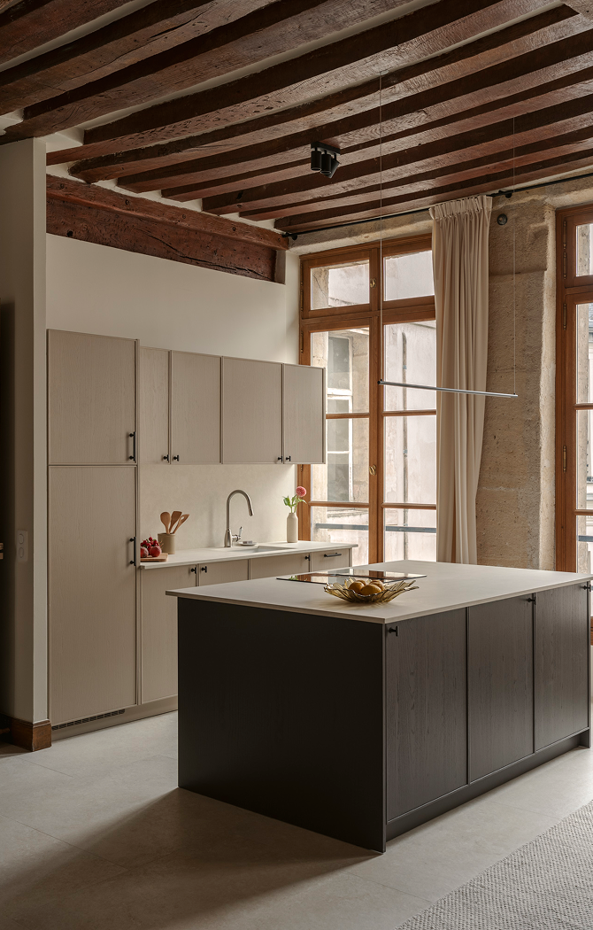 En die mythe reikt verder dan vergulde spiegels en kroonluchters, en leeft vooral in subtiele details die een pand karakter verlenen. “De Parijse stijl draait niet om versiering, maar om materialen. Dáár schuilen echte allure en elegantie.” Hier, in deze woning, leeft de ziel van Le Marais verder in de zichtbare balken, natuursteen, pure texturen en zorgvuldig geselecteerde antieke stukken. Een sfeervolle wisselwerking tussen verleden en heden, in lijn met de geest van de buurt. Het resultaat is een tijdloze plek met respect voor de oorspronkelijke architectuur die naadloos aansluit bij het moderne leven.